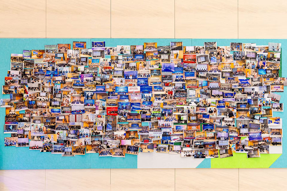 模速空间内部的照片墙,展示为AI企业举办的各类活动。媒体管家官网【njmeiti.com】